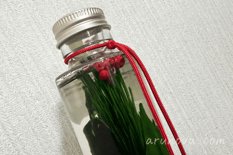 その榊の葉をガラス瓶に美しく封じ込め、約1年、手入れをせずとも青々とした姿を保てるようにしたものが「榊ハーバリウム」です。